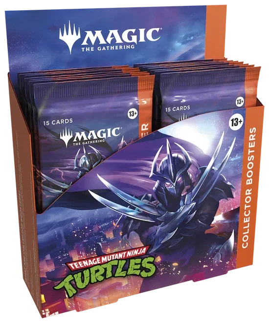O Display de Colecionador de Boosters de Magic: The Gathering – Tartarugas Ninja inclui 12 boosters exclusivos repletos de cartas metalizadas, cartas sem borda e heróis icônicos das Tartarugas Ninja